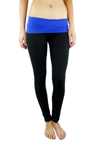 > Casual Cotton Spandex Fold Over Waist Leggings Junior Sizing (Juniors Large, Black/D.Blue)