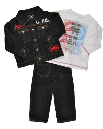 Outfit Includes: short-sleeve tee with graphic design on front, with denim jacket with button down closure and 2-pocket detail, and matching jean with basic 5-pocket detail and zip and button closure on front. Check out our other Ecko Unltd. items to keep your little one in style!